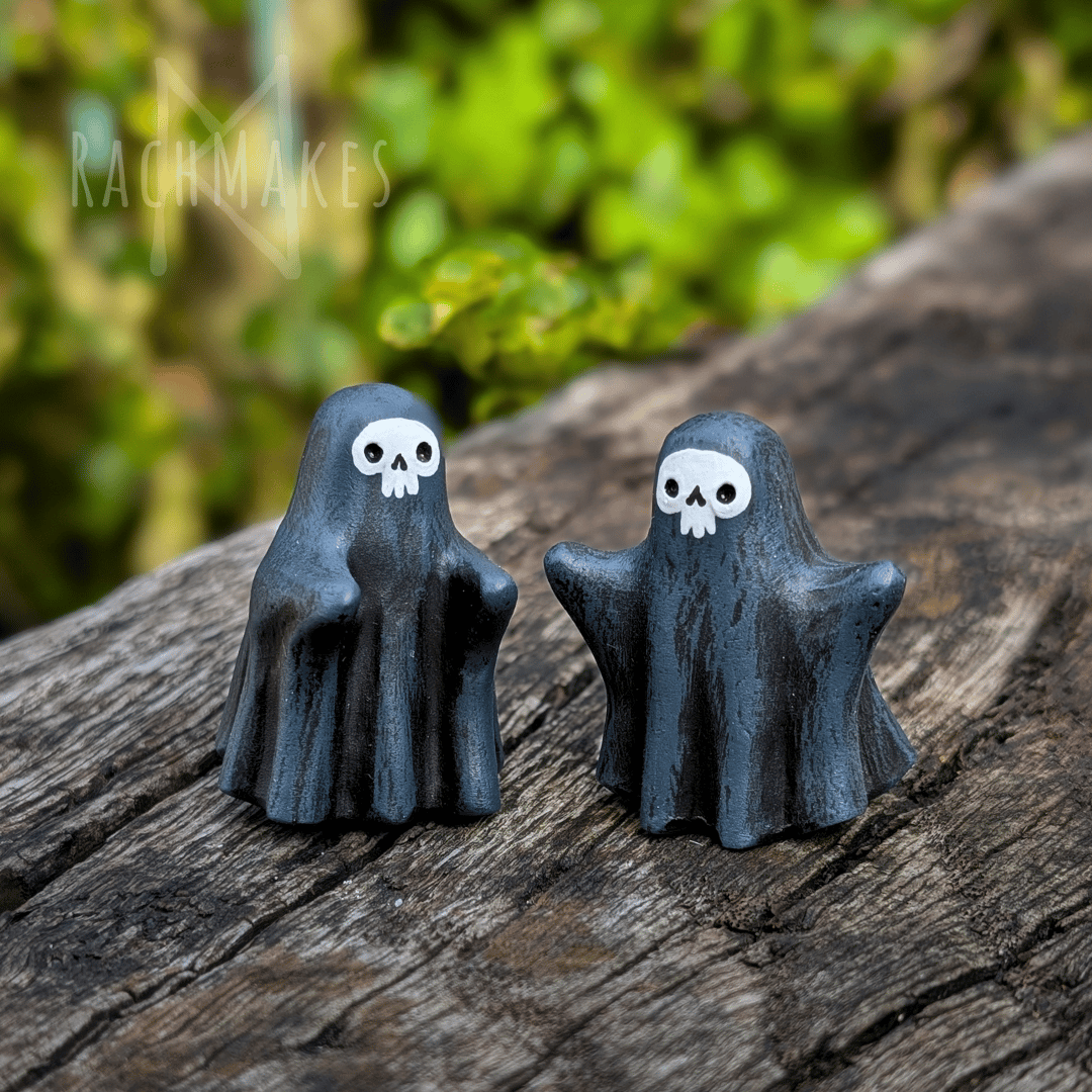 Large Ghosties are approx 6.5cm tall and come with a randomly selected D20 dice. Medium ghosties sit perfectly in between the mini and large ghostie sizes and are approximately 4cm tall.